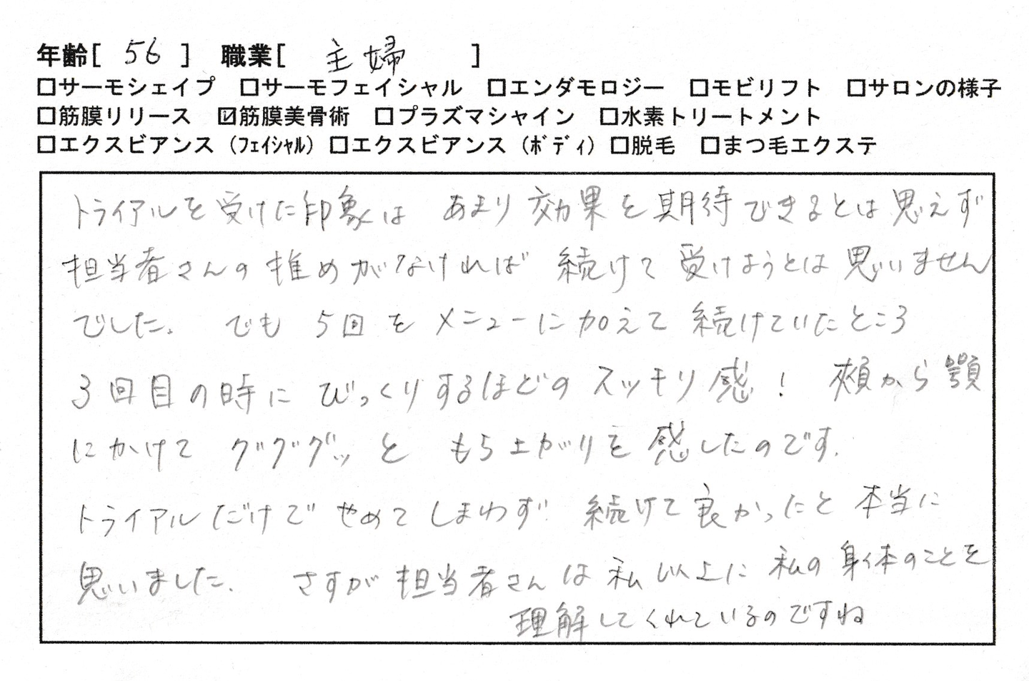 トライアルを受けた印象は、あまり効果を期待できるとは思えず、担当者さんの薦めがなければ続けて受けようとは思いませんでした。でも5回メニューに加えて続けてみたところ3回目の時にビックリするほどのスッキリ感!頬からアゴにかけてグググッと持ち上がりを感じたのです。トライアルだけで辞めてしまわず続けて良かったと本当に思いました。