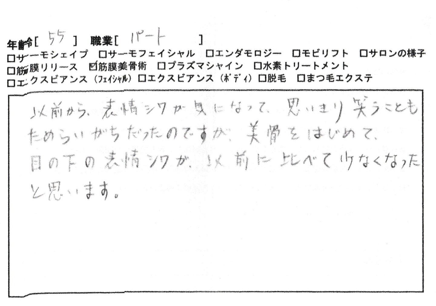 以前から表情ジワが気になって、思い切り笑う事もためらいながらだったのですが、美骨術をはじめて目の下の表情ジワが、以前に比べて少なくなったと思います。