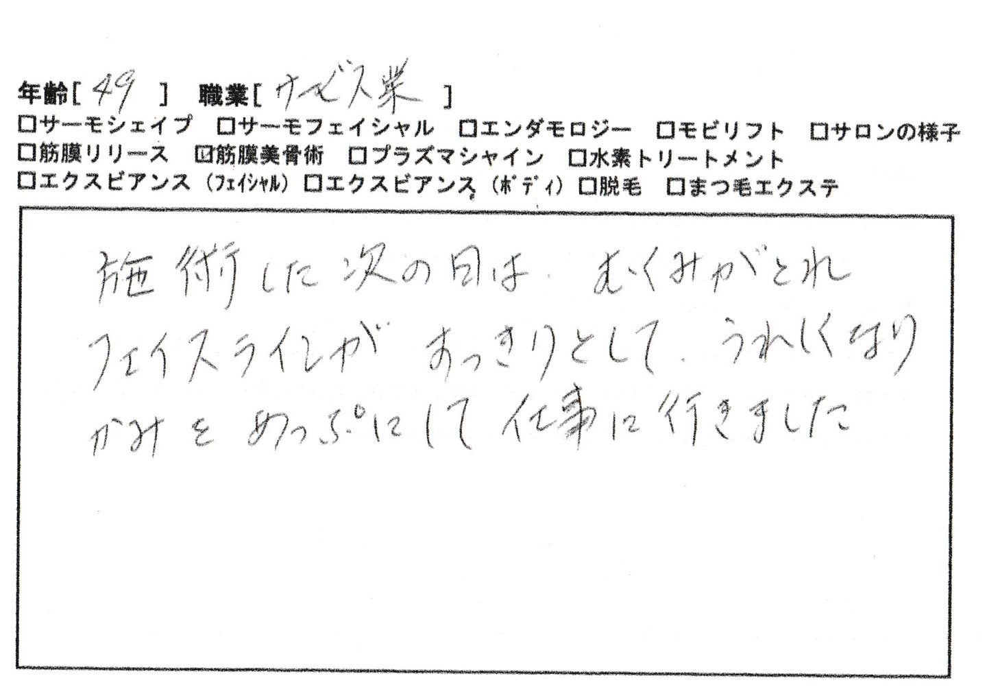 施術した次の日は、むくみがとれ、フェイスラインがすっきりとしてうれしくなり、髪をアップにして仕事に行きました。