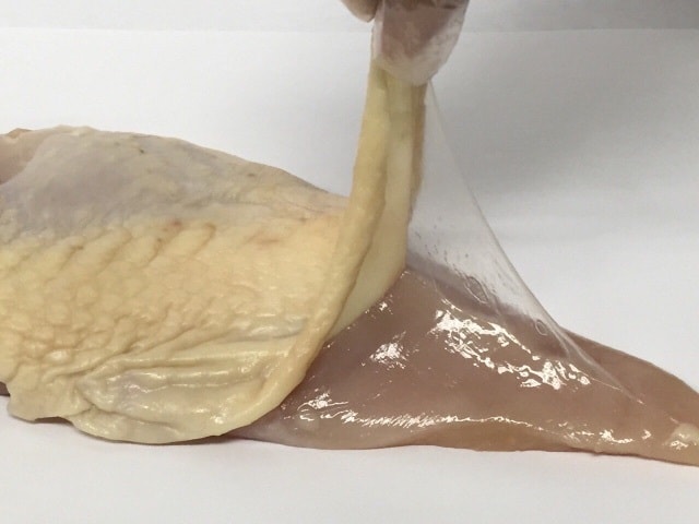 写真は鶏肉の筋膜です。筋膜とは、身体の中にある筋肉を包み込む膜です。そう、私達の身体を包み込む全身タイツみたいな物です。骨や内蔵器官や関節なども覆って臓器を正常な場所に位置づけたり、身体のバランスを保つのに大切な役割をしています。