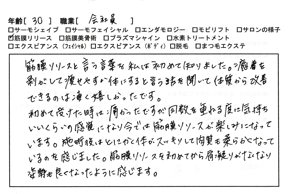 初めて受けた時は痛かったですが回数を重ねるたびに気持ちいいくらいの感覚になり今では筋膜リリースが楽しみになっています。施術後はとにかく体がスッキリして肉質も柔らかくなっているのを感じました。筋膜リリースを始めてから肩こりがなくなり姿勢も良くなったように感じます。