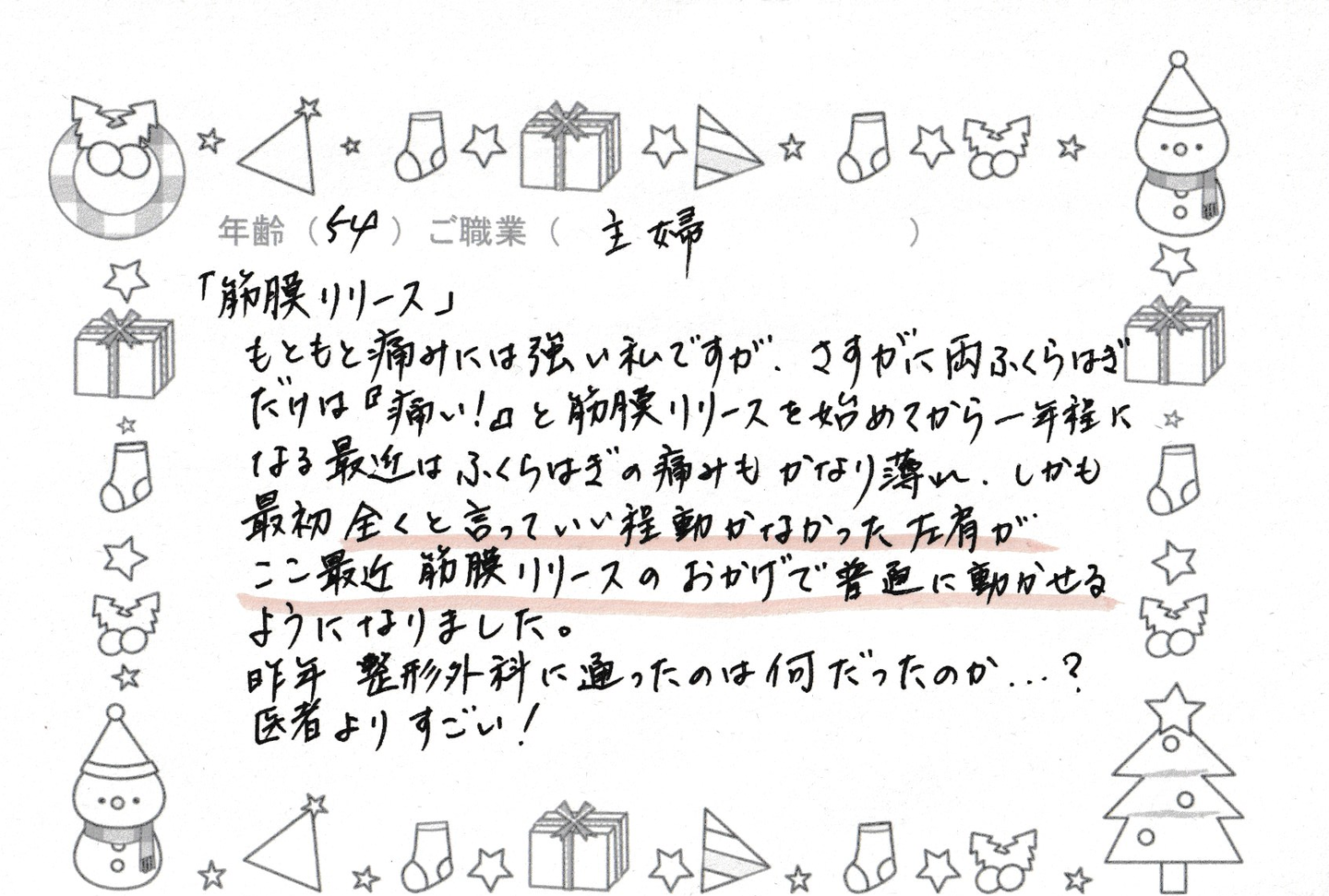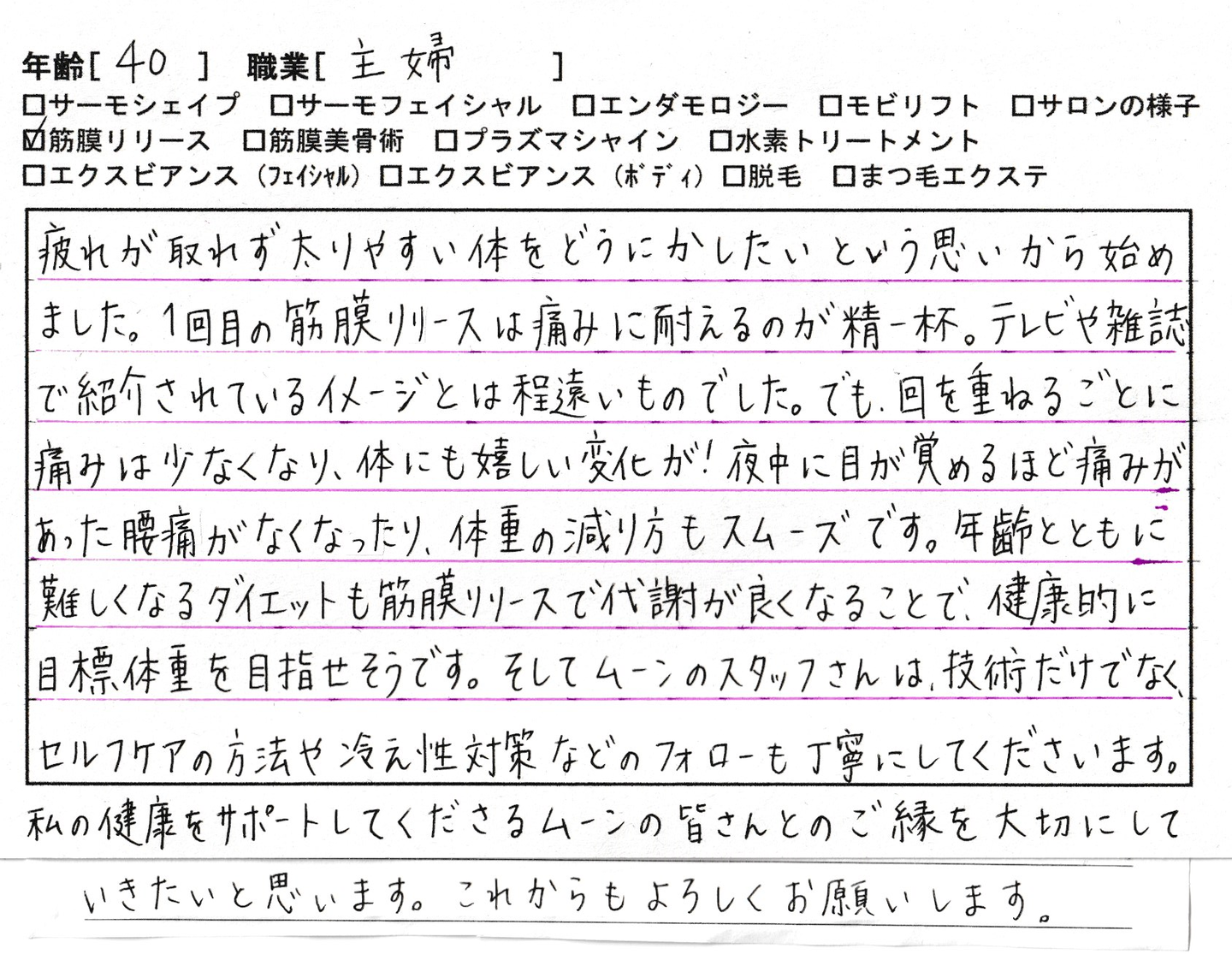 疲れが取れず太りやすい体をどうにかしたいという思いから始めました。1回目の筋膜リリースは痛みに耐えるのが精一杯。テレビや雑誌で紹介されているイメージとは程遠いものでした。でも回を重ねるごとに痛みは少なくなり、身体にも嬉しい変化が!!夜中に目が覚めるほど痛みがあった腰痛が無くなったり体重の減り方もスムーズです。年齢とともに難しくなるダイエットも筋膜リリースで代謝が良くなる事で健康的に目標体重を目指せそうです。そしてムーンのスタッフさんは技術だけでなく、セルフケアの方法や冷え性対策などのフォローも丁寧にして下さいます。私の健康をサポートしてくださるムーンの皆さんとのご縁を大切にしていきたいと思います。これからも宜しくお願いします。