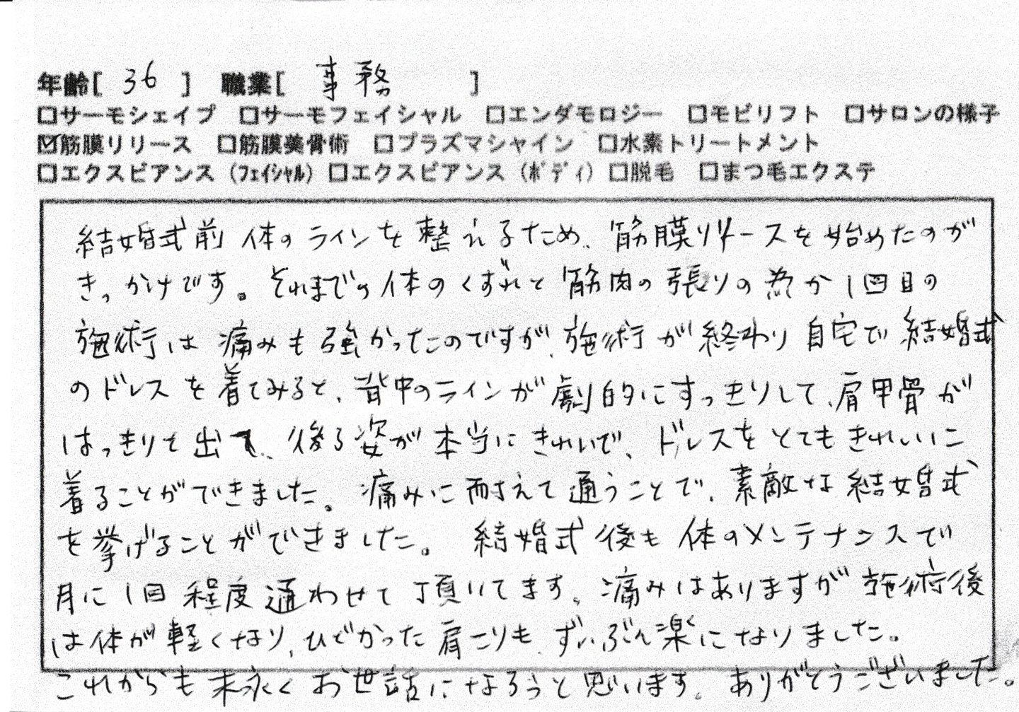 結婚式前、身体のラインを整えるため筋膜リリースを始めたのがきっかけです。それまでの体のくずれと筋肉の張りの為か1回目の施術は痛みも強かったのですが、施術が終わり自宅で結婚式のドレスを着てみると背中のラインが劇的にすっきりして肩甲骨がはっきりと出て後ろ姿が本当にきれいで、ドレスをきてもキレイに着る事ができました。痛みに耐えて通う事で、素敵な結婚式を挙げる事ができました。結婚式後も身体のメンテナンスで月に1回程度通わせて頂いてます。痛みはありますが施術後は体が軽くなり、ひどかった肩こりも随分楽になりました。これからも末永くお世話になろうと思います。ありがとうございました。
