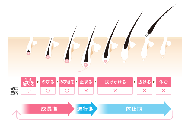 脱毛は、毛に照射した光が熱に変換され毛に作用。痛みも肌への負担もありません。毛には図のように毛周期というサイクルがあり、脱毛は成長期の毛が対象になります。全ての毛をケアする為、毛の生えるサイクルに合わせた施術を行います。