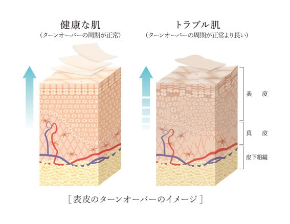 ターンオーバーとはお肌の古い細胞が新しい細胞に押されて皮膚の表面に上がり、最終的に自然にはがれ落ちるサイクルのことです。この肌が新しく生まれ変わるサイクルが、様々な要因により遅延してくると様々なお悩みが表面化してくる事がわかっています。