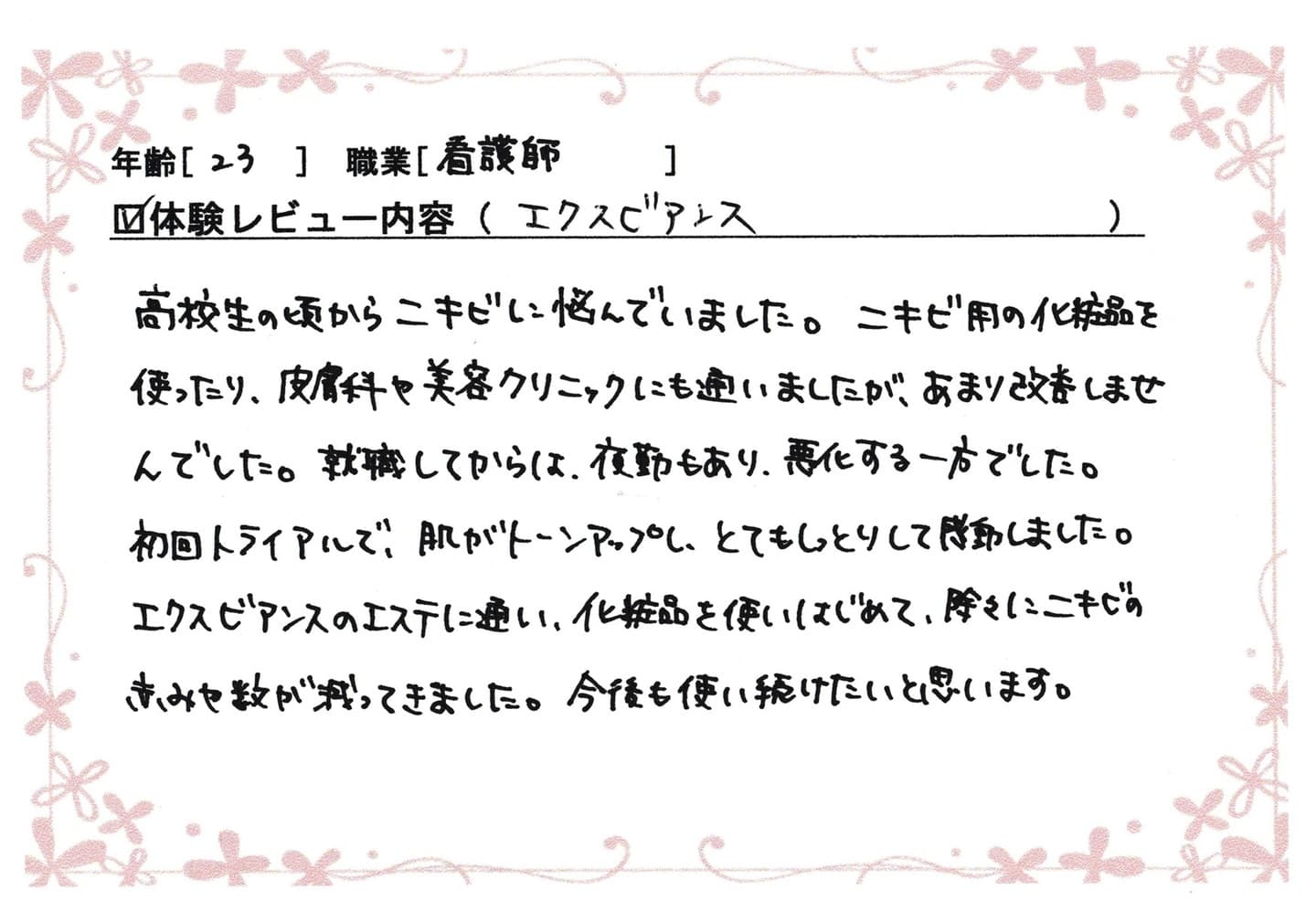 高校生の頃からニキビに悩んでいました。ニキビ用の化粧品を使ったり、皮膚科や美容クリニックにも通いましたが、あまり改善しませんでした。就職してからは、夜勤もあり悪化する一方でした。初回トライアルで肌がトーンアップし、とてもしっとりして感動しました。エクスビアンスのエステに通い、化粧品を使い始めて徐々にニキビの赤みや数が減ってきました。今後も使い続けたいと思います。