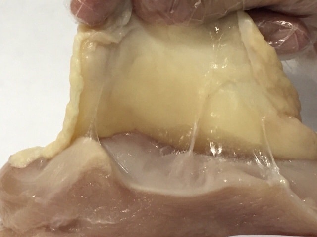 写真は鶏肉の筋膜です。筋膜とは、身体全身にある筋肉を包み込む膜です。そう、私達の身体を包み込む全身タイツみたいな物です。骨や内蔵器官や関節なども覆って臓器を正常な場所に位置づけたり、身体のバランスを保つのに大切な役割をしています。