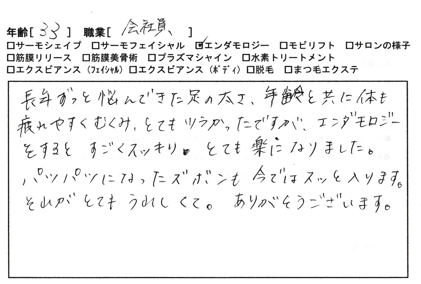 長年ずっと悩んできた足の太さ、年齢と共に体も疲れやすくむくみ、とてもツラかったですが、エンダモロジーをすると、すごくスッキリ♡