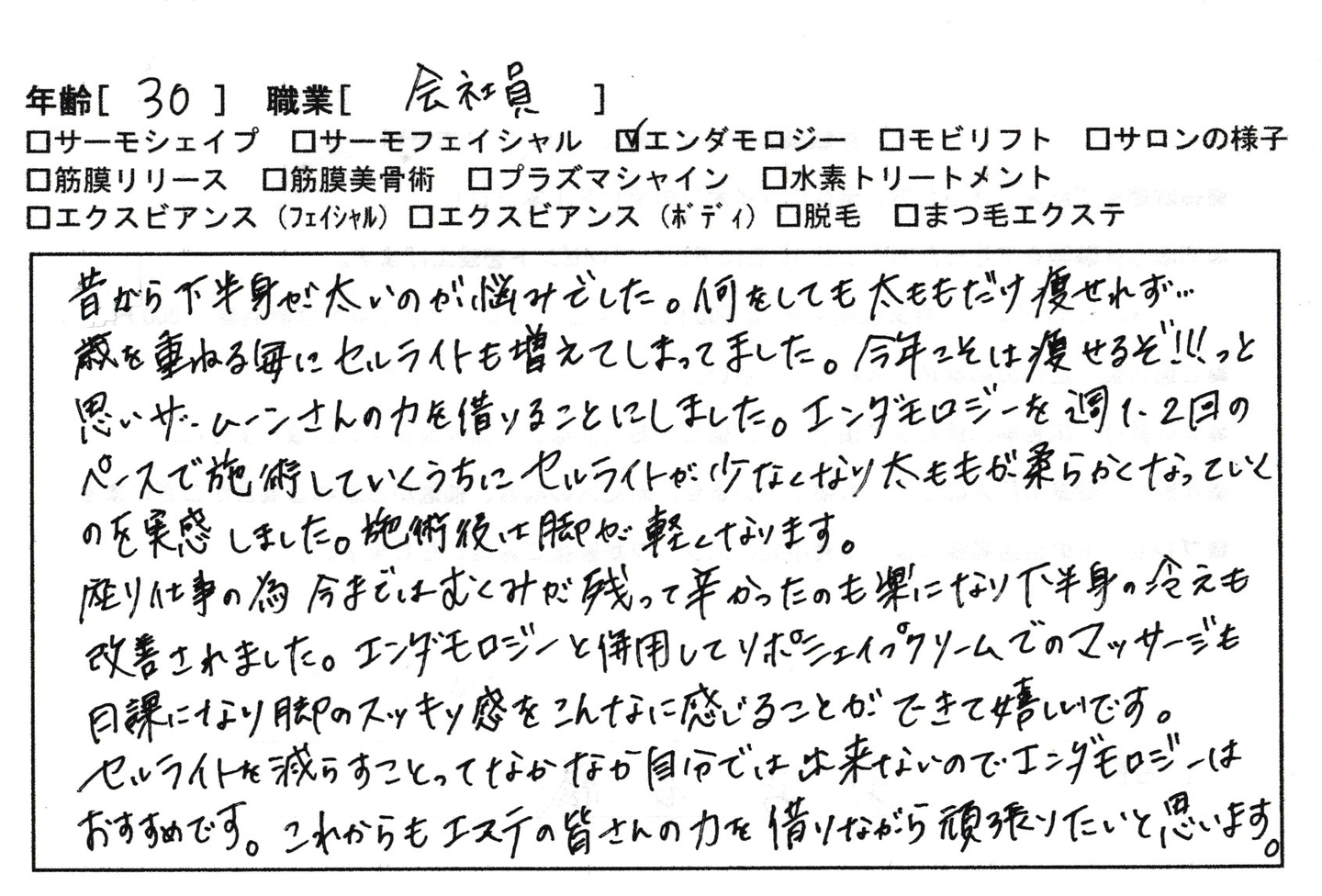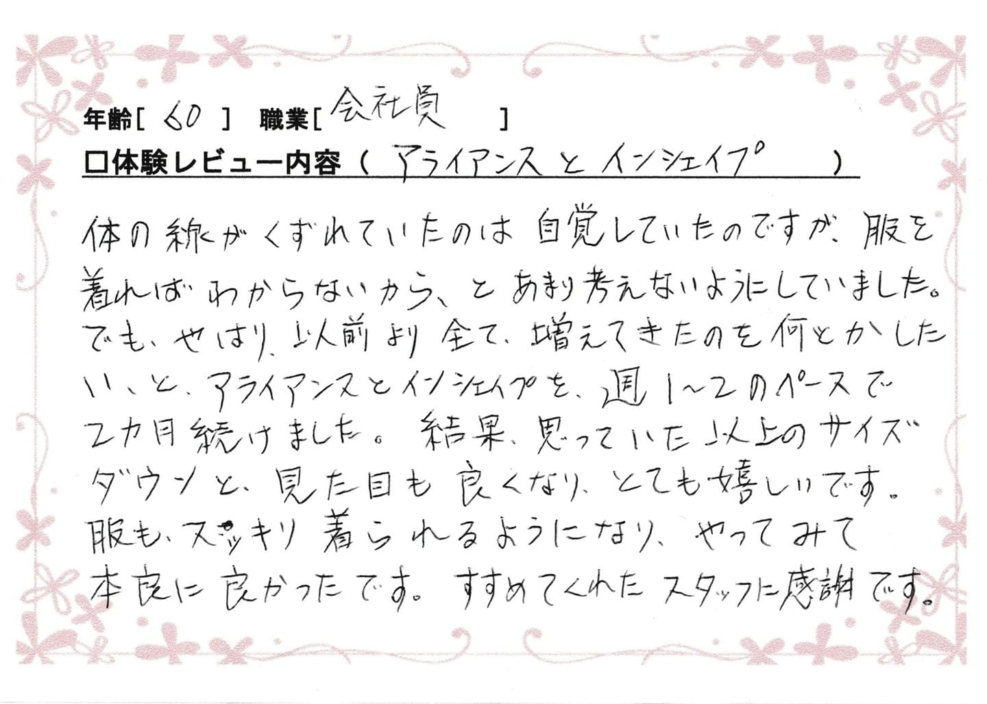 体の線が崩れていたのは自覚していたのですが、服を着ればわからないから。とあまり考えないようにしていました。でもやはり以前より全て増えてきたのを何とかしたいとアライアンス(エンダモロジー)とインシェイプを週1~2のペースで2か月続けました。結果、思っていた以上のサイズダウンと見た目も良くなり、とても嬉しいです。