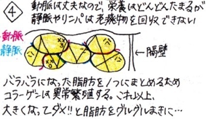 バラバラになった脂肪をまとめようと、コラーゲンは必死で異常繁殖します。脂肪がこれ以上大きくならないよう、さらに脂肪をグルグル巻きにします。