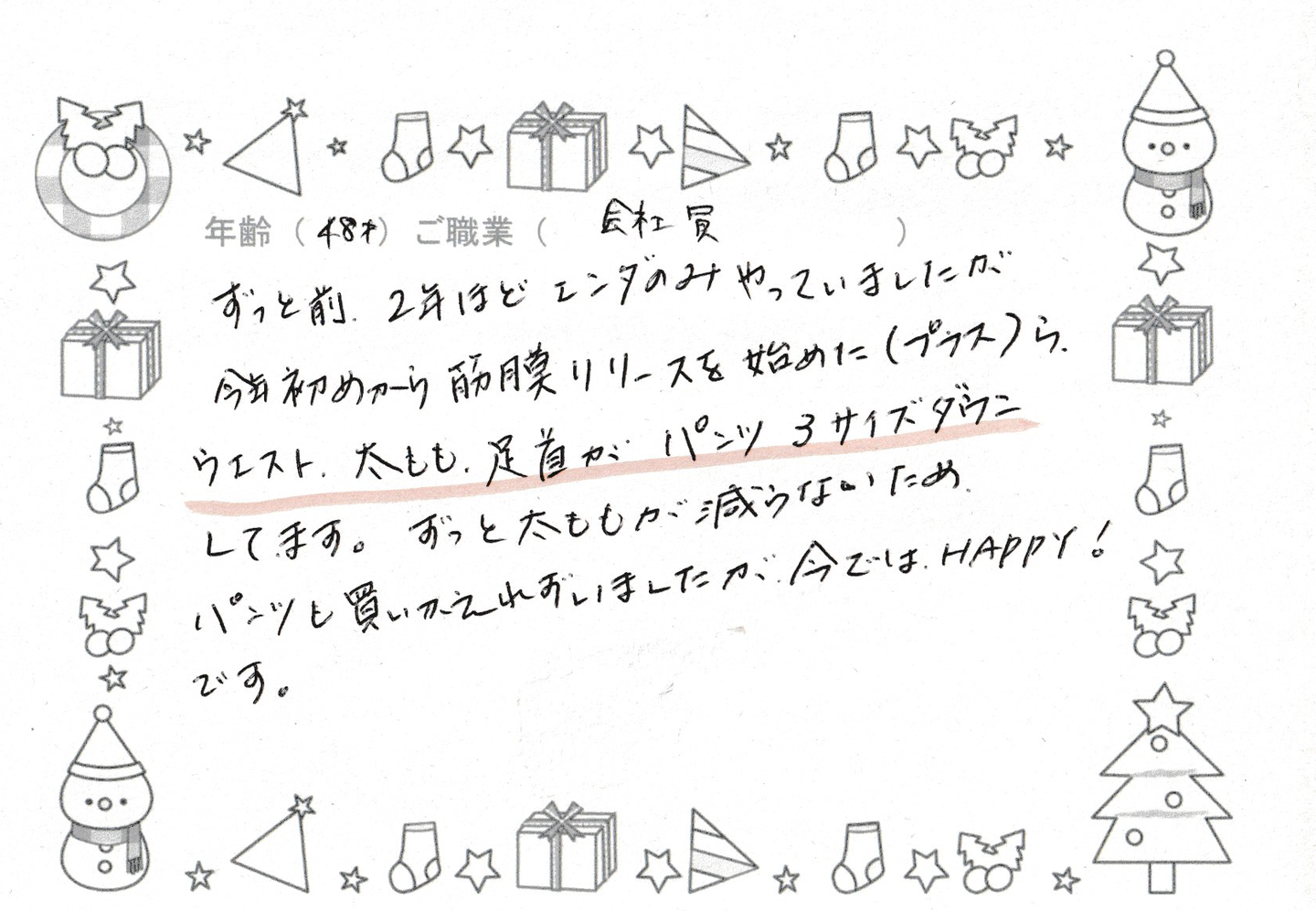 ずっと前、2年ほどエンダモロジーのみやっていましたが、今年初めから筋膜リリースも始めたら、ウエスト、太もも、足首がパンツ3サイズダウンしてます。ずっと太ももが減らない為パンツも買い替えずいましたが、今ではHAPPY!です。