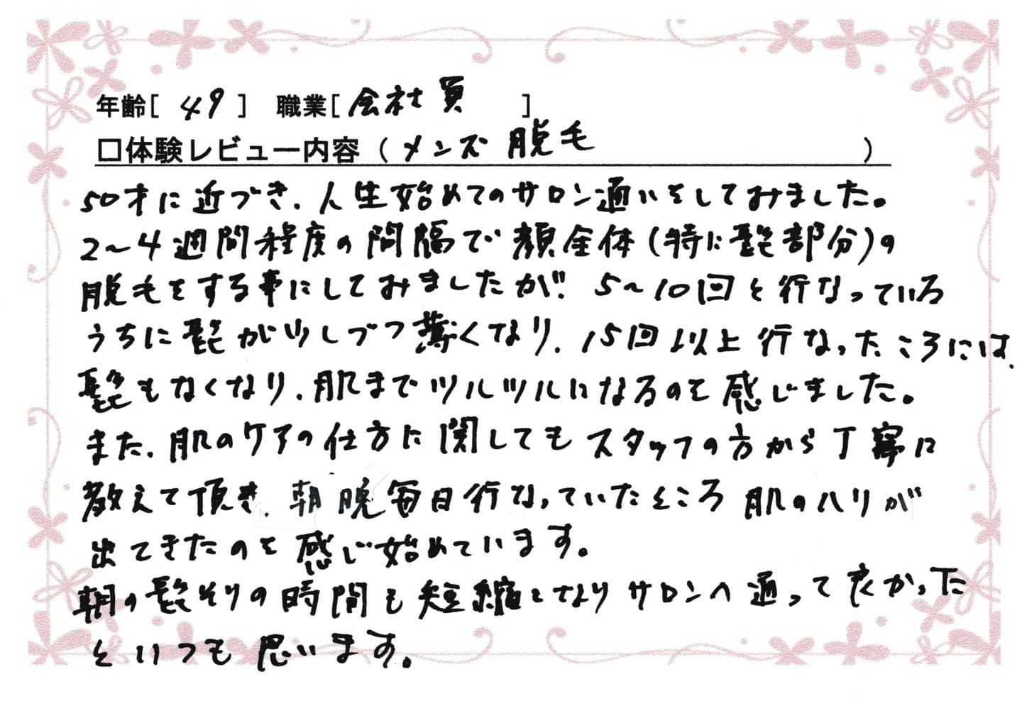 朝の髭そりの時間も短縮となり、サロンへ通ってよかったといつも思います。