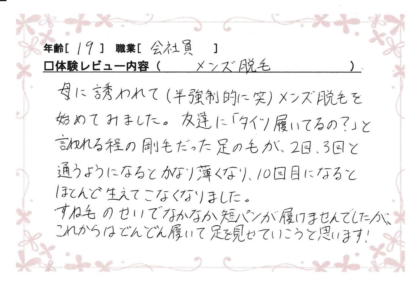 母に誘われて(半強制的に(笑))メンズ脱毛を始めてみました。友達に「タイツ履いてるの?」と言われるほどの剛毛だった足の毛が2回、3回と通うようになるとかなり薄くなり、10回目になるとほとんど生えてこなくなりました。