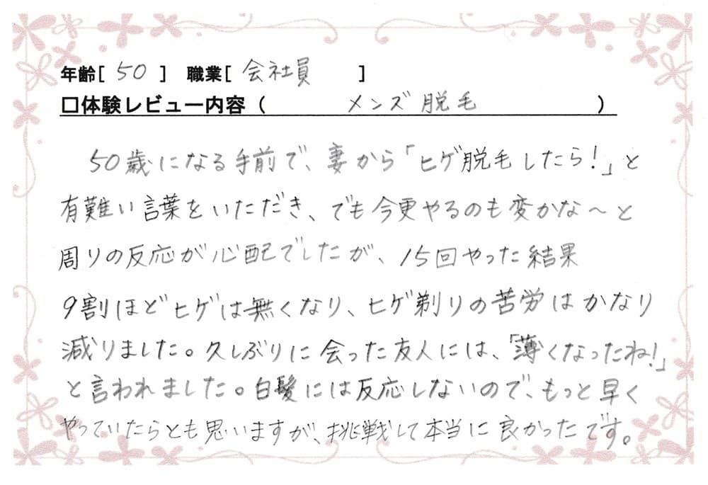 50歳になる手前で、妻から「ヒゲ脱毛したら!」と有難い言葉をいただき、でも今更やるのも変かな~と周りの反応が心配でしたが、15回やった結果9割ほどヒゲは無くなり、ヒゲ剃りの苦労はかなり減りました。久しぶりにあった友人には「薄くなったね!」と言われました。白髪には反応しないので、もっと早くやっていたらとも思いますが、挑戦して本当に良かったです。