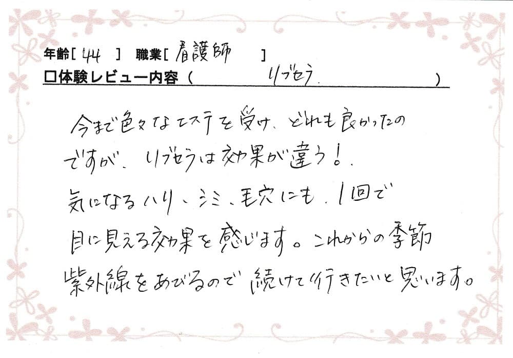 今まで色々なエステを受け、どれも良かったのですが、リブセラは効果が違う!