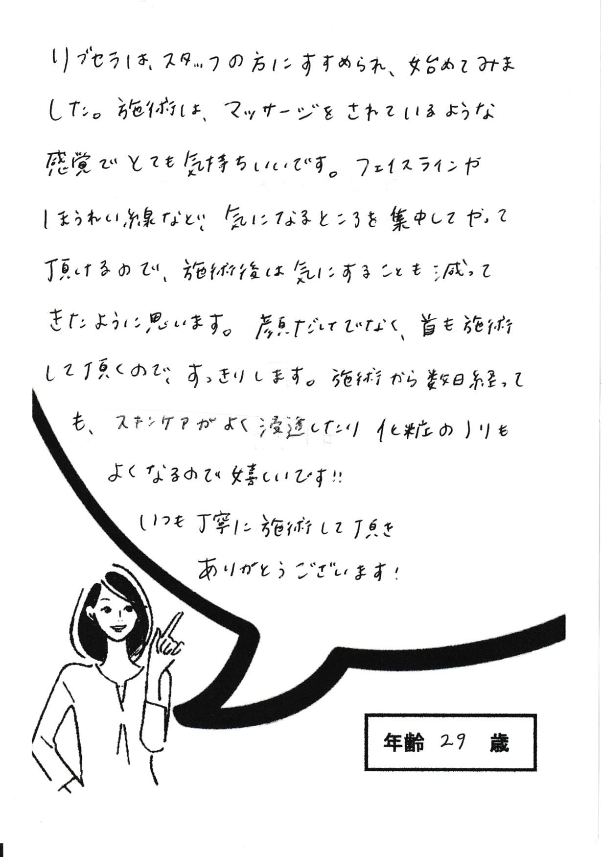 リブセラは、スタッフの方にすすめられ始めてみました。施術はマッサージをされたような感覚でとても気持ちいいです。フェイスラインやほうれい線など、気になるところを集中してやって頂けるので、施術後は気にすることも減ってきたように思います、顔だけでなく、首も施術していただくのでスッキリします。施術から数日経ってもスキンケアがよく浸透したり、化粧のノリもよくなるので嬉しいです。いつも丁寧に施術して頂きありがとうございます!
