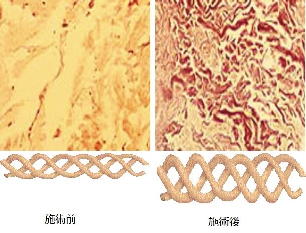 部が加熱されると、コラーゲン繊維が引き締まり、繊維芽細胞が活性化されます。新陳代謝が促進されることで、コラーゲン繊維を増加させ、ハリのある肌を取り戻します。