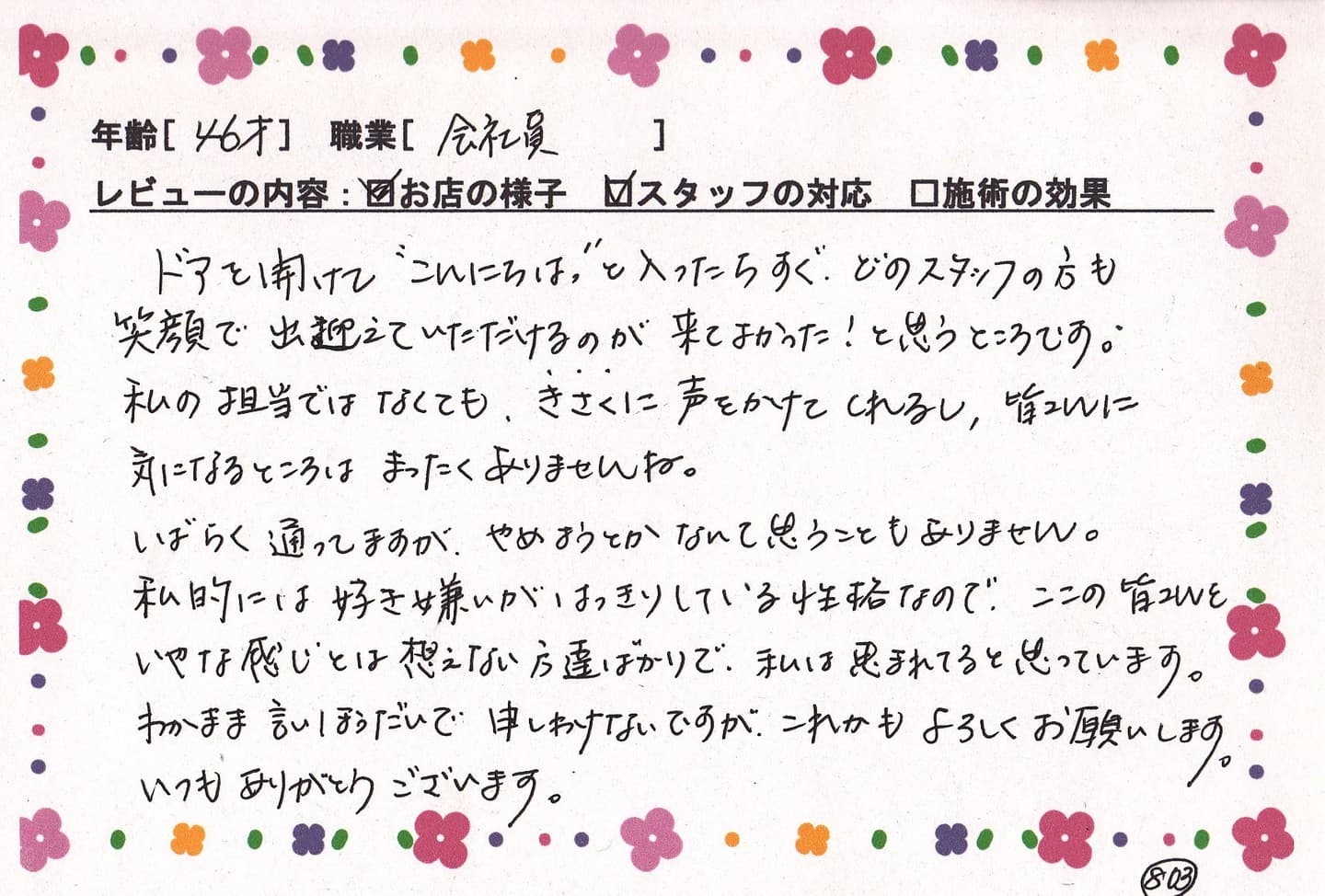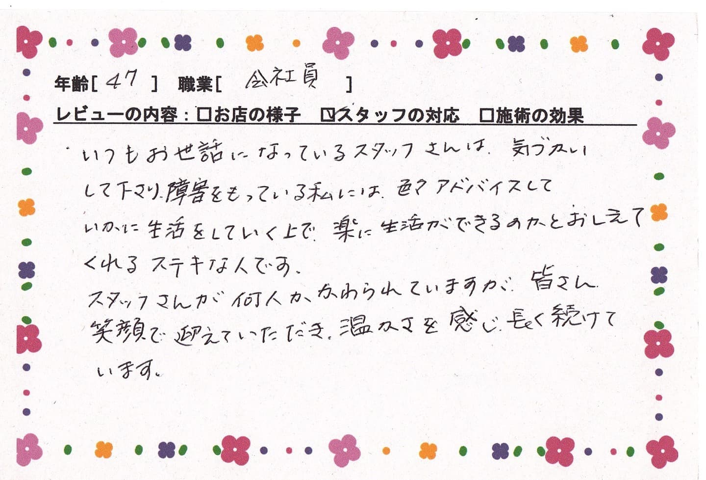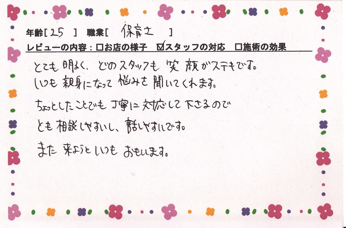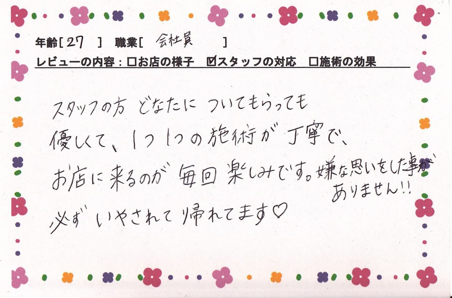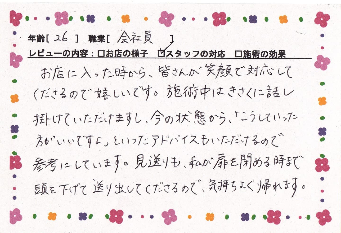 お店に入った時から、皆さんが笑顔で対応してくださるので嬉しいです。施術中は気さくに話しかけていただけますし、今の状態から「こうしていった方が良いですよ」と言ったアドバイスも頂けるので参考にしています。見送りも、私が扉を閉める時まで頭を下げて送り出して下さるので、気持ちよく帰れます。