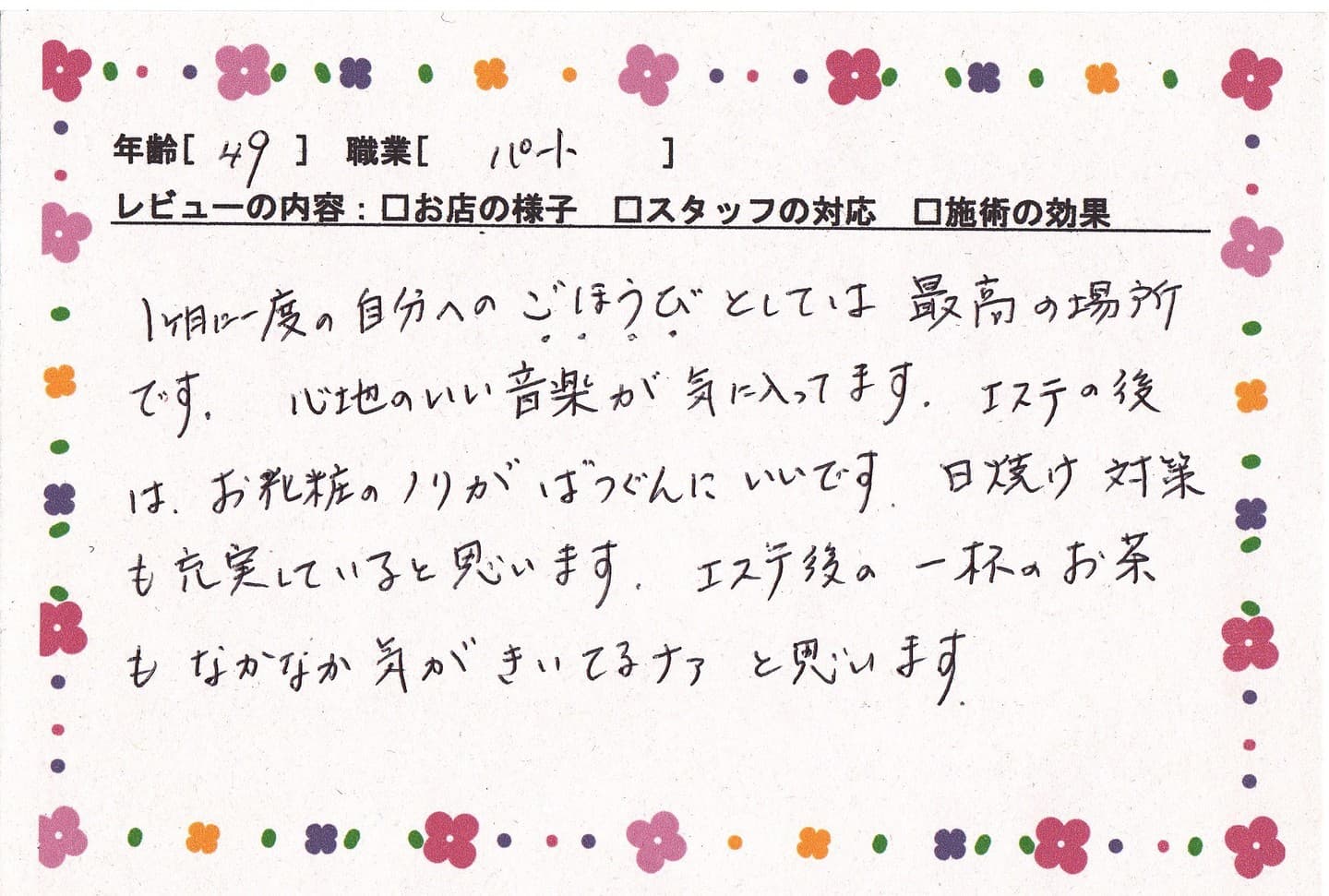 1ヶ月に1度の自分へのご褒美としては最高の場所です。心地の良い音楽が気に入ってます。エステの後は、お化粧ノリが抜群に良いです。日焼け対策も充実していると思います。エステ後の一杯のお茶もなかなか気がきいてるなぁと思います。
