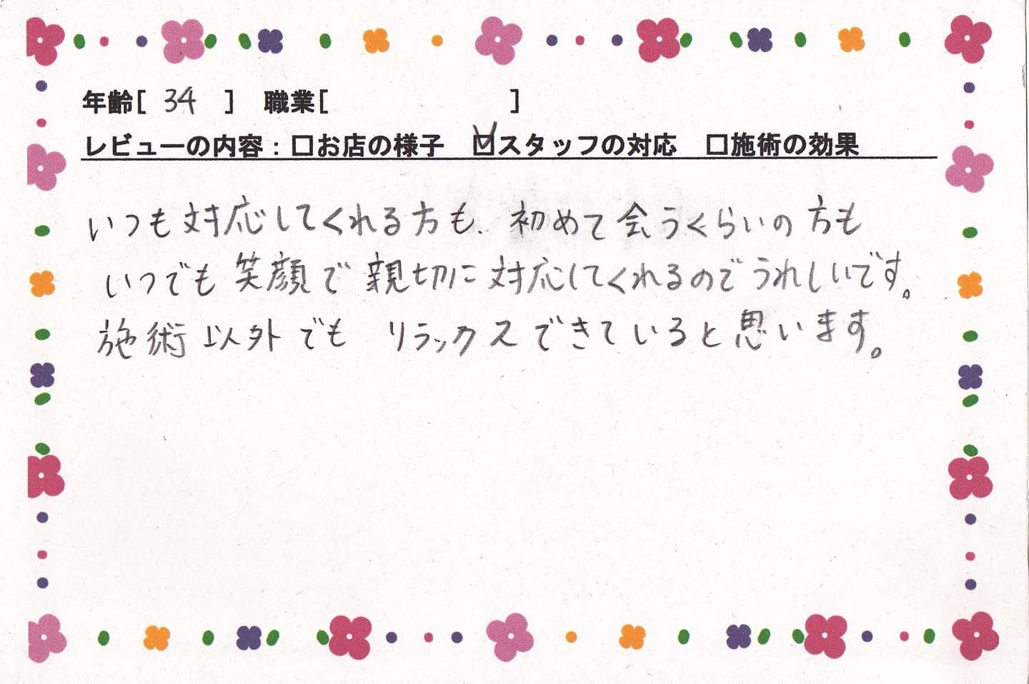 いつも対応してくれる方も、初めて会うくらいの方も、いつでも笑顔で親切に対応してくれるので嬉しいです。施術以外でもリラックスできていると思います。