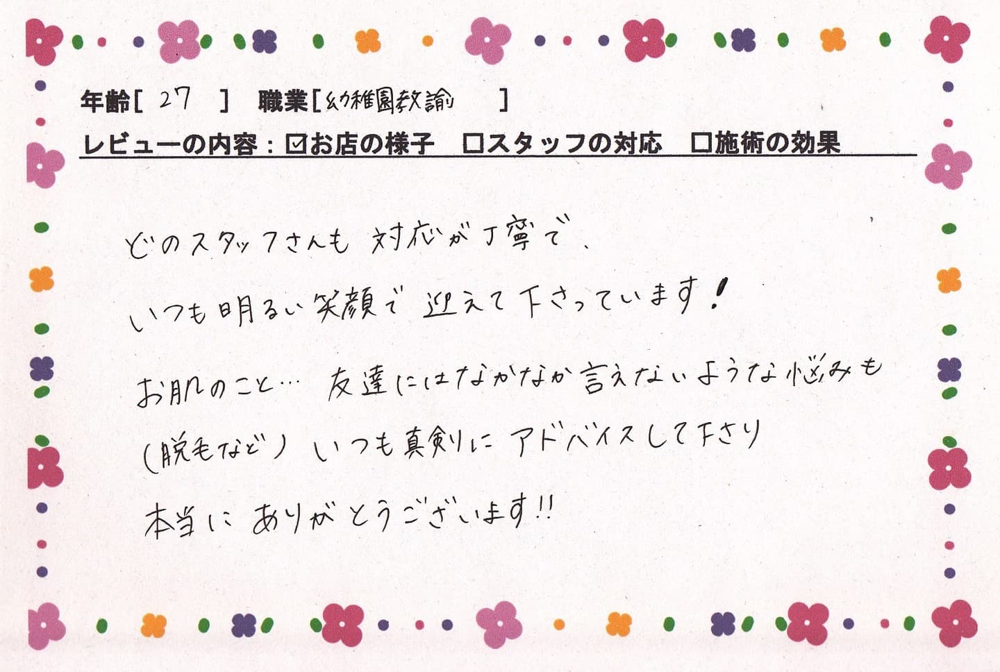 どのスタッフさんも対応が丁寧で、いつも明るい笑顔で迎えてくださいます!お肌のこと・・・友達にはなかなか言えないような悩みも(脱毛など)いつも真剣にアドバイスして下さり本当にありがとうございます!!
