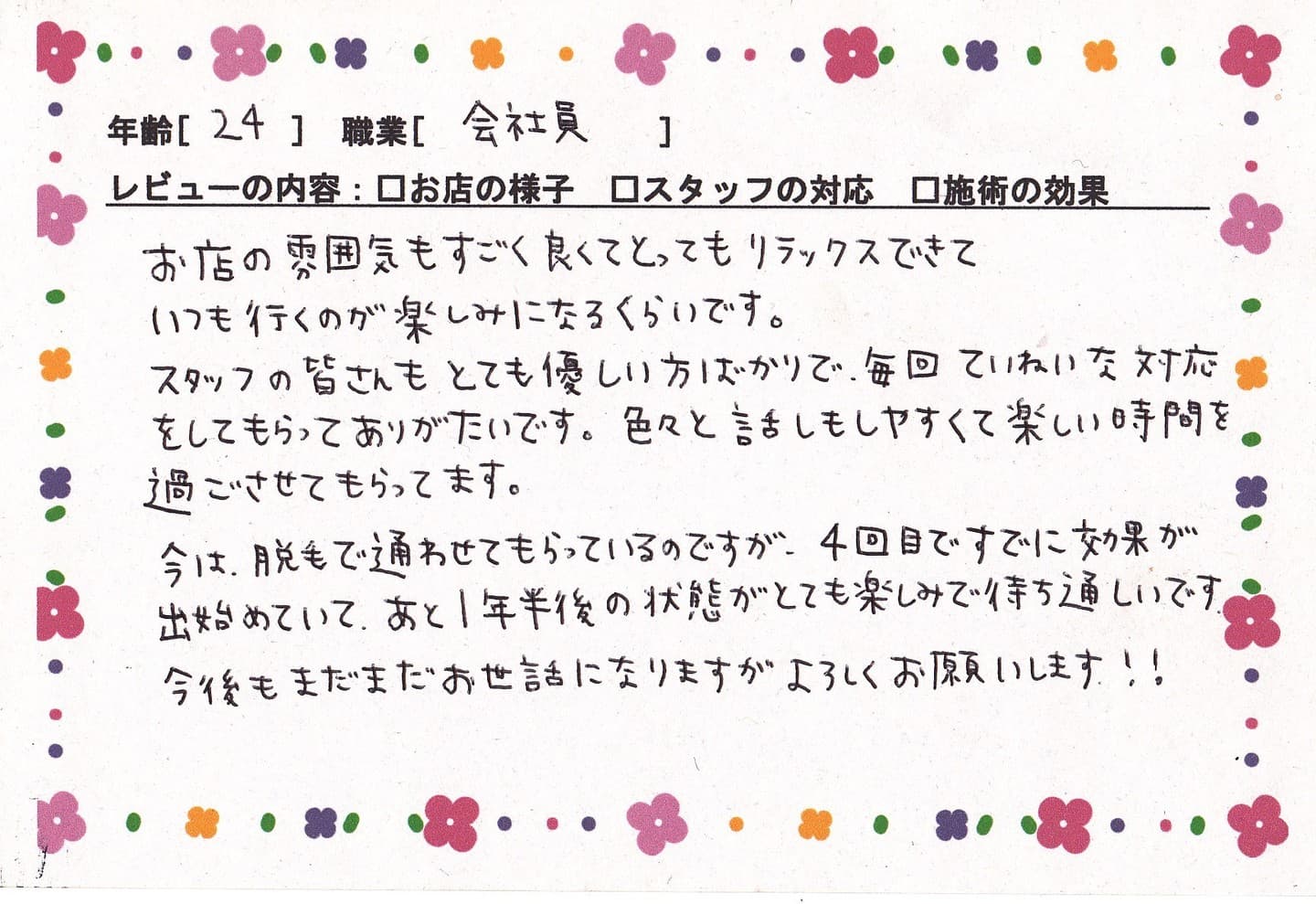 お店の雰囲気もすごく良てとてもリラックスできていつも行くのが楽しみになるくらいです。スタッフの皆さんもとても優しい方ばかりで、毎回ていねいな対応をしてもらってありがたいです。色々と話もしやすくて楽しい時間を過ごさせてもらってます。今は脱毛で通わせてもらっているのですが、4回目ですでに効果が出始めていて、あと1年半後の状態がとても楽しみで待ち遠しいです。今後もまだまだお世話になりますが、宜しくお願いします!!